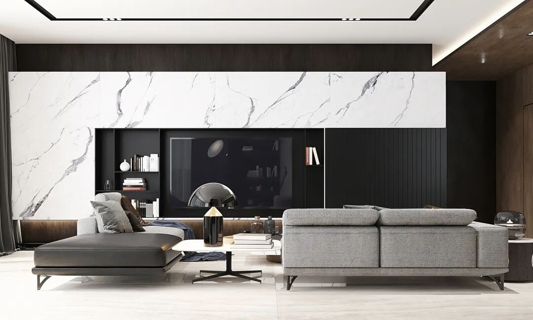 | 茶几应用_PROXIMA阿尔卑斯白系列岩板;墙面应用_PROXIMA缪斯系列岩板;地面应用_PROXIMA盖亚系列岩板