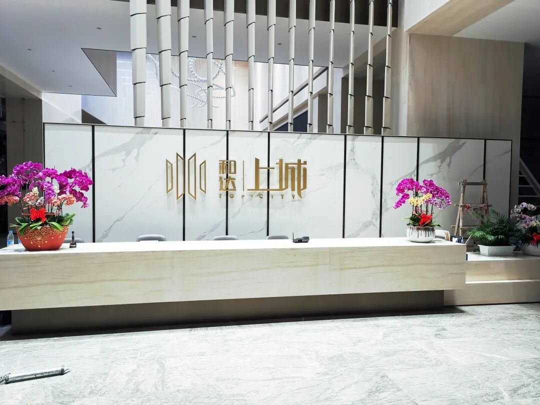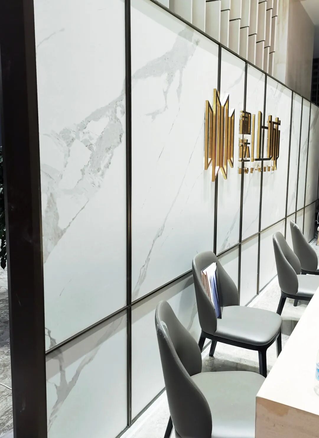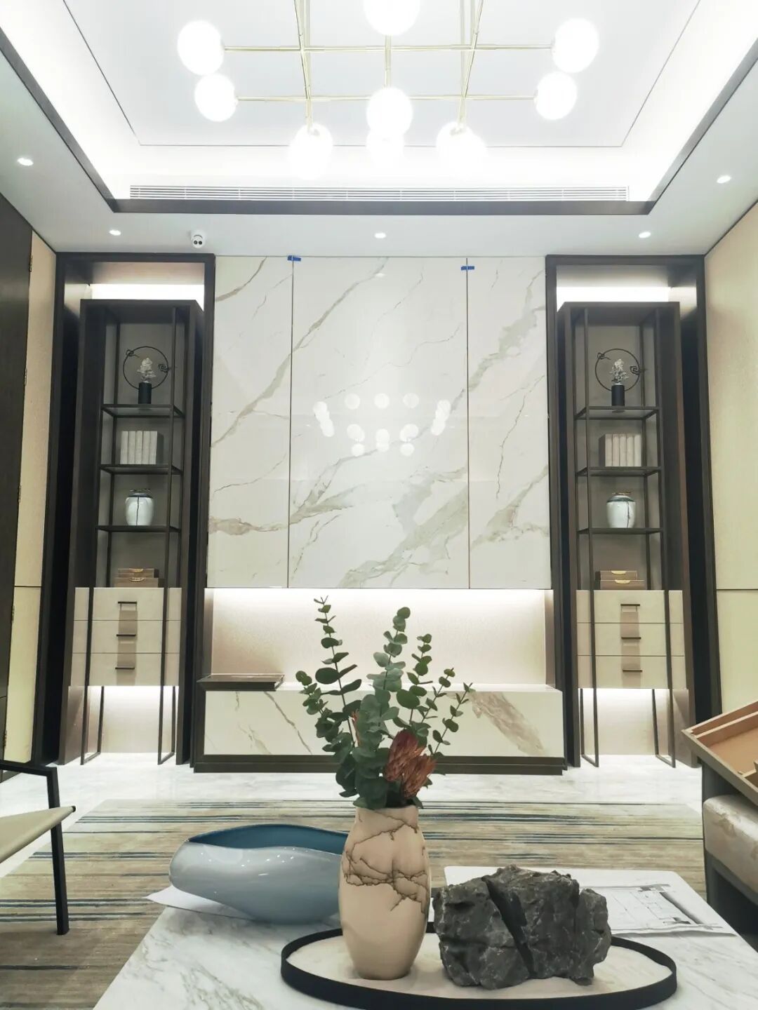 项目中庭的色调清雅闲适,PROXIMA雪花白系列岩板连贯流畅的纹理,突显了和达·上城LOGO的质感,同时柔化了金色元素的硬朗,为其平添些许的优雅与灵动。