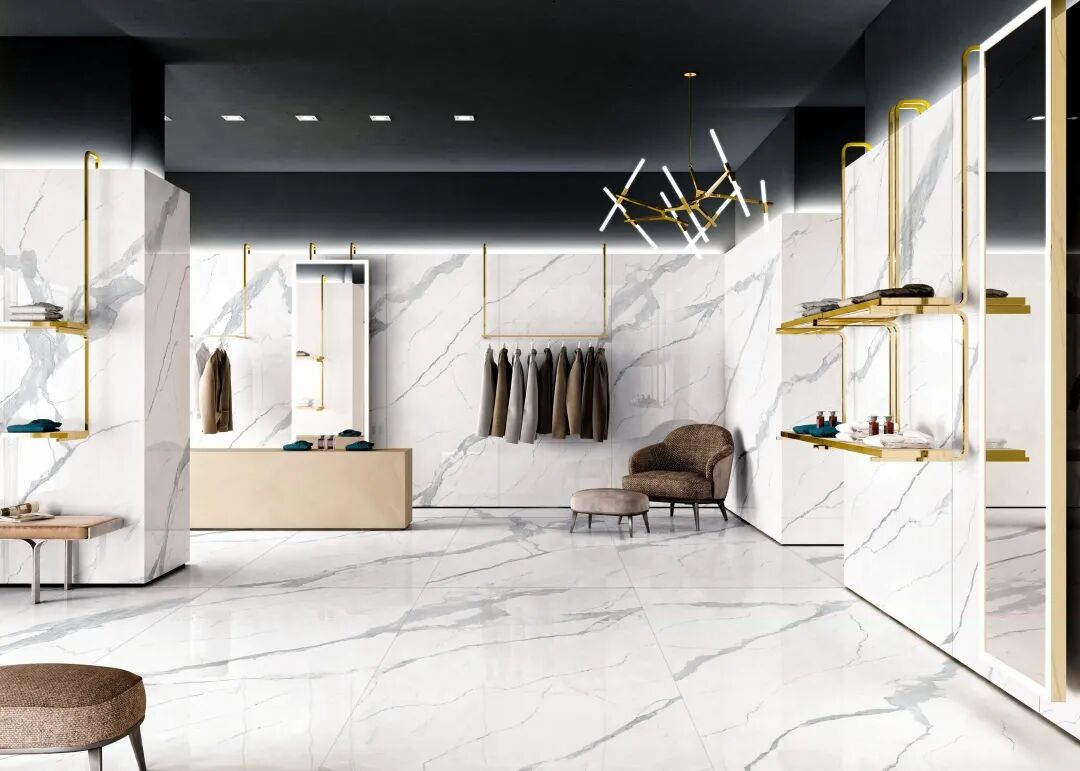 PROXIMA雪花白岩板在此案例中应用面积不是十分大,但足以装下一个品牌的用心。