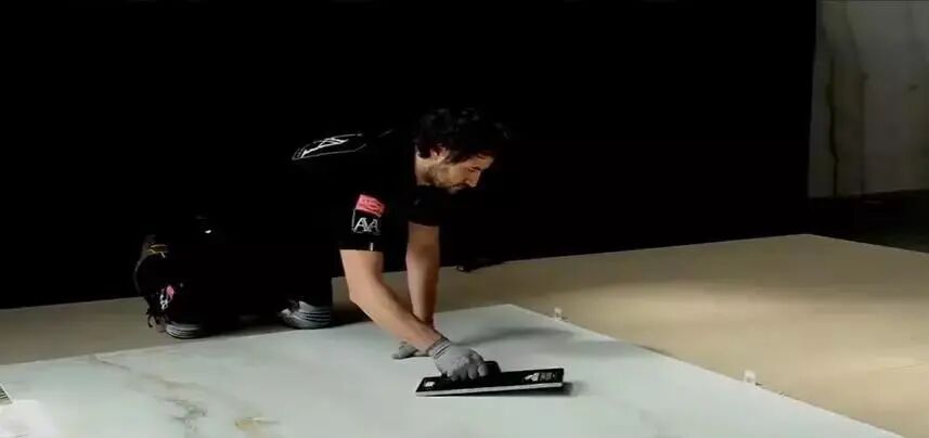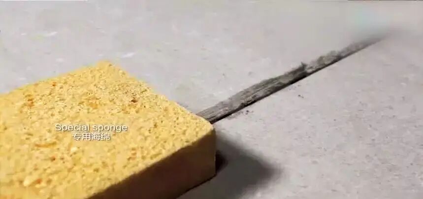及时将残留的胶黏剂和灰尘沙土清洁干净,岩板铺贴24小时后才能进行美缝。