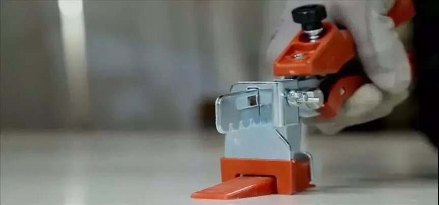 在已定位好的岩板边缘周围每60cm左右插入找平器底座,检验平整后插入找平楔子并夹紧找平器,调节相邻大板的表面平整度,并将大板间隙调整为2mm左右,以便后续美缝剂处理。