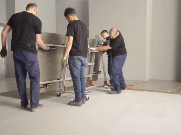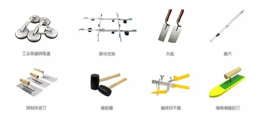 铺贴之前,我们需要准备好铺贴岩板的工具,工业级瓷砖吸盘、移动固定架、特制瓷砖防护移动支架、轻质塑胶锤、刚制抹浆刀、瓷砖找平器、长效瓷砖胶、海绵填缝刮刀、清洁工具等。