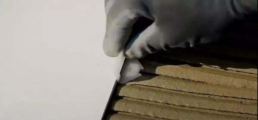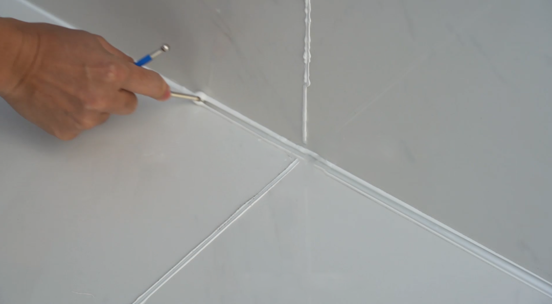 首先用勾缝刀将砖缝中的胶粘剂清除,然后用羊毛扫将砖缝中的粉尘清理,将美缝剂安装在枪后,先挤出前段30-40公分未混合均匀的美缝剂并舍弃,然后沿着岩板缝注入美缝剂并填充饱满,使用压缝球压缝。