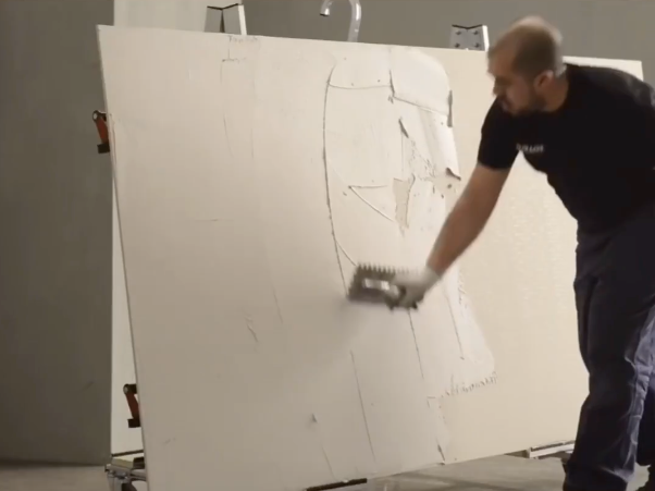 岩板背面涂抹,需用齿状抹灰器均匀的将瓷砖胶抹成条齿状。注意刮胶时基面与大板需朝同一方向刮齿纹,便于空气排出,避免瓷砖胶空鼓而造成开裂脱落现象。