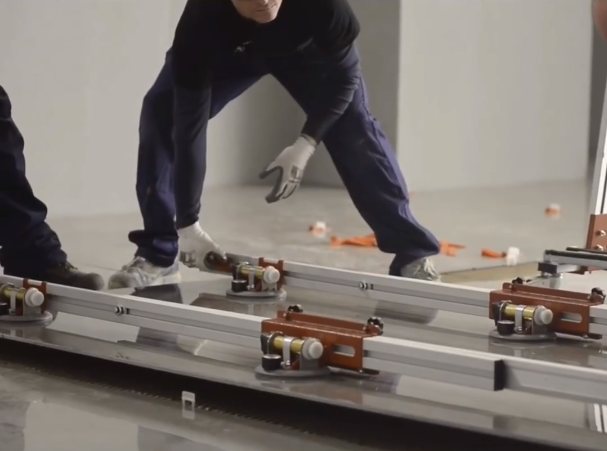 检测确认没有问题后,通过专用工具(吸盘)搬运至指定位置,搬运时需要合理安排人员和工具,确保岩板无破损。(在处理和移动之前,建议使用湿润的海绵清洁瓷砖的吸盘触面,以取得更好的吸力。)