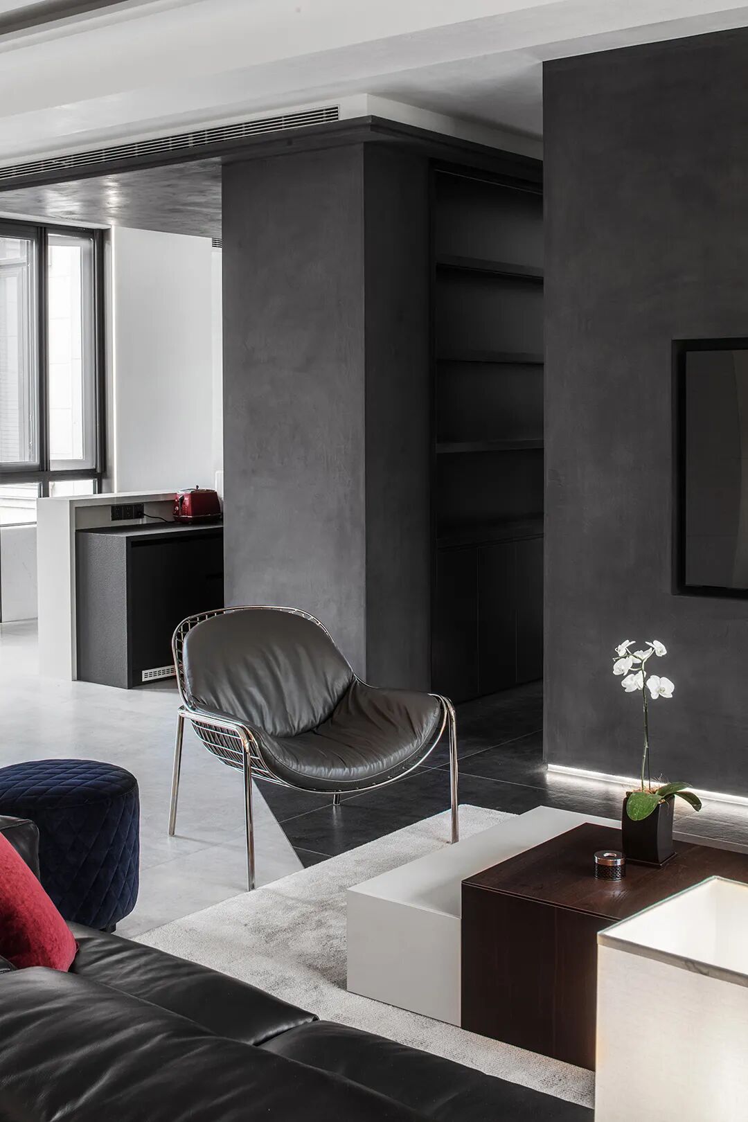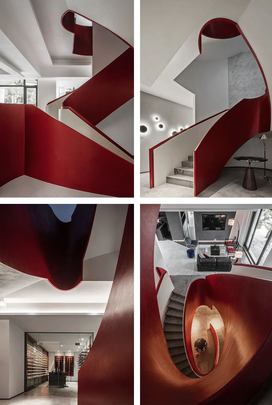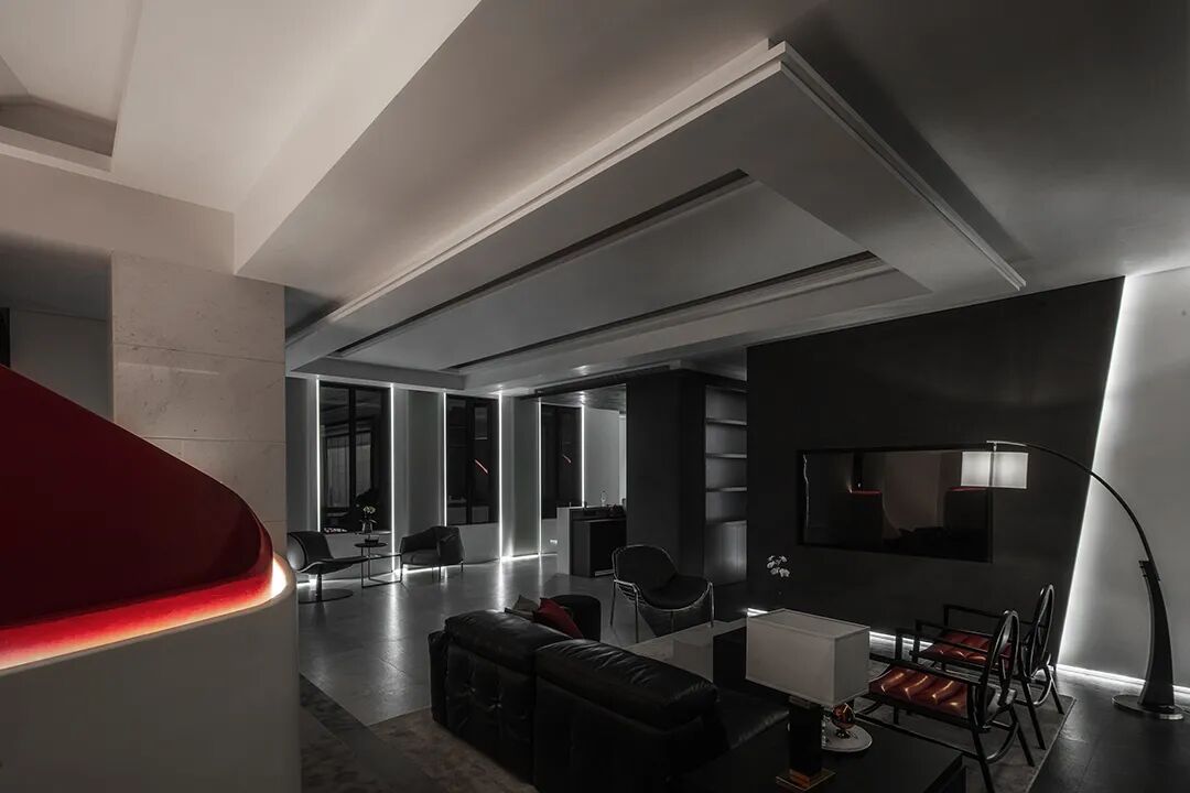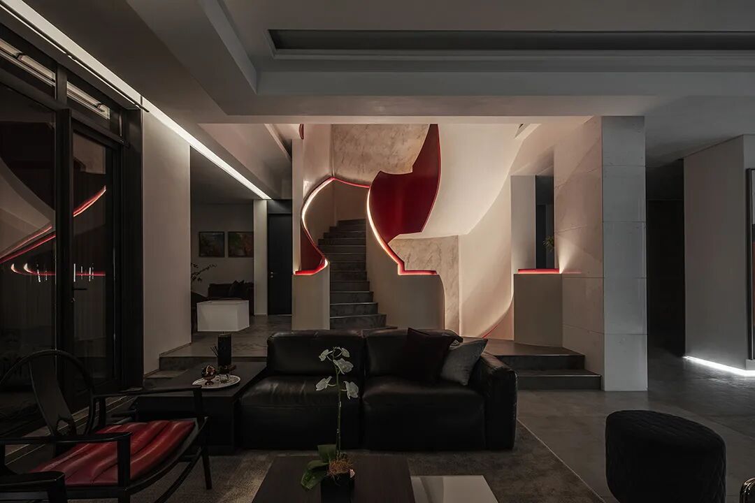 红色旋转楼梯,形成鲜明的对比,为空间添加一股随性有张力却不失美感的个性主张,既有对未来生活好奇的探索和期许,又有从容安逸的内在态度,带来高雅简奢的视觉享受。