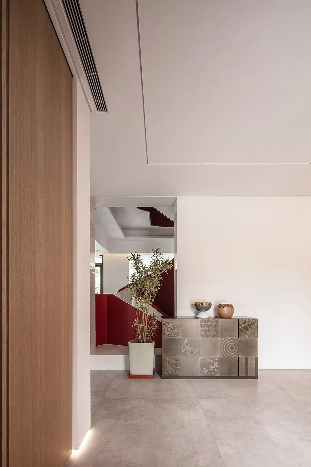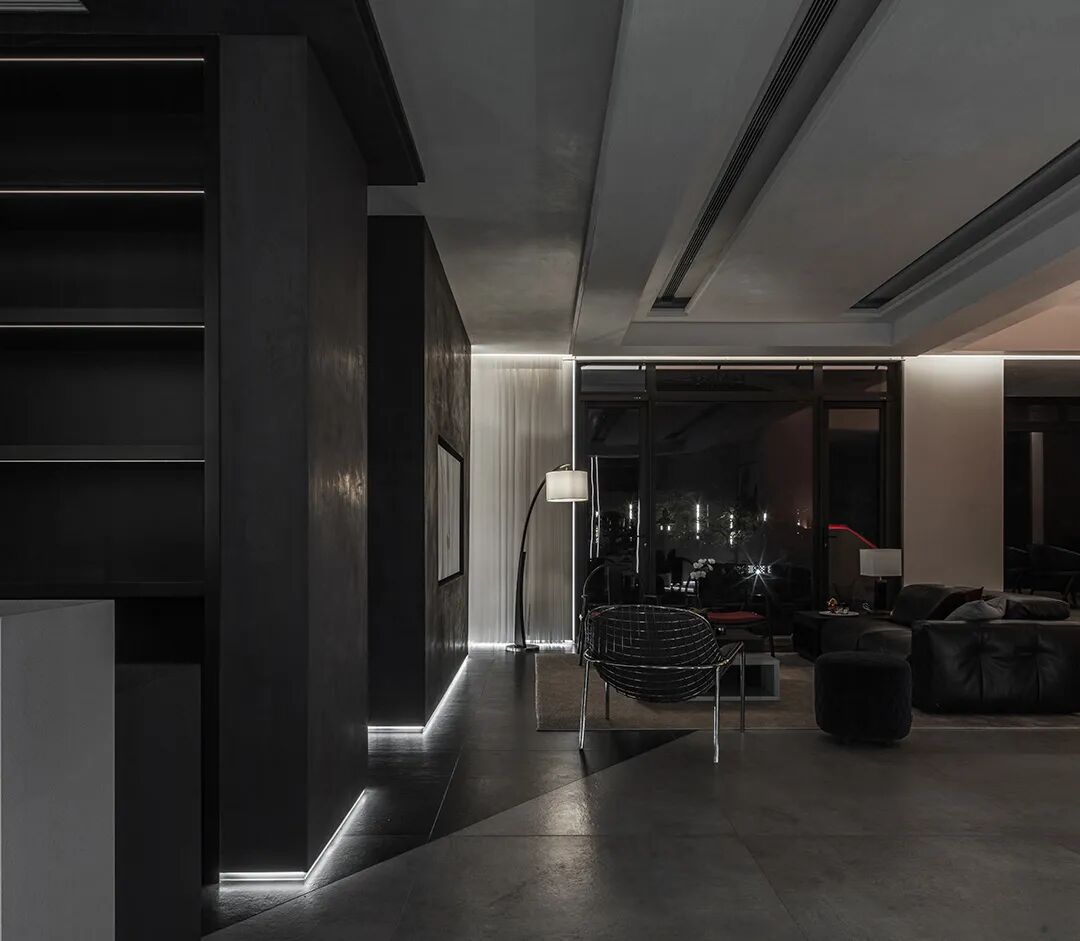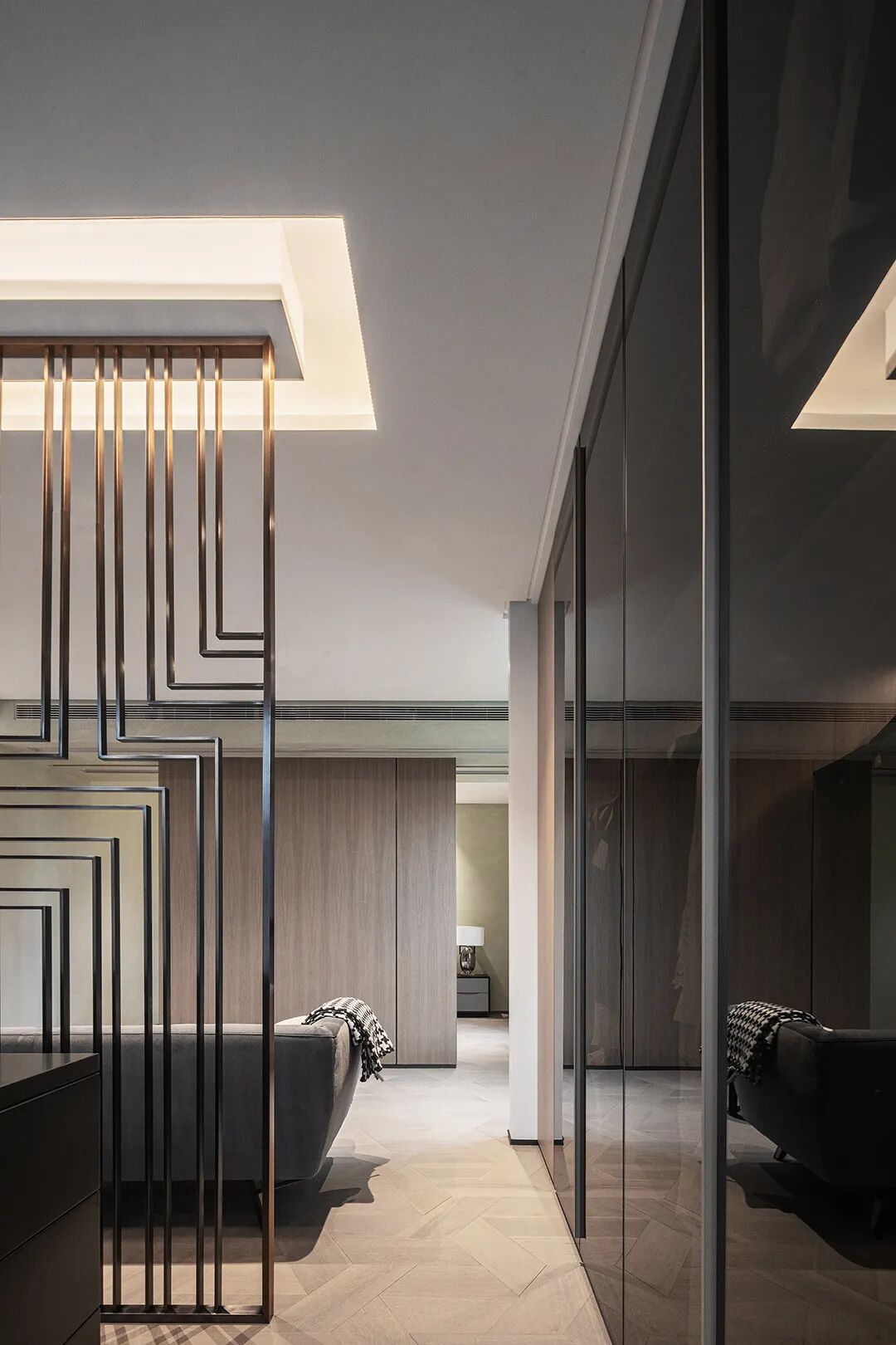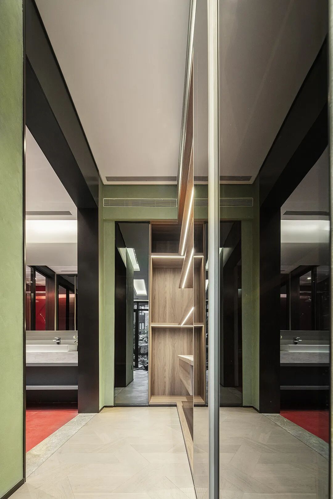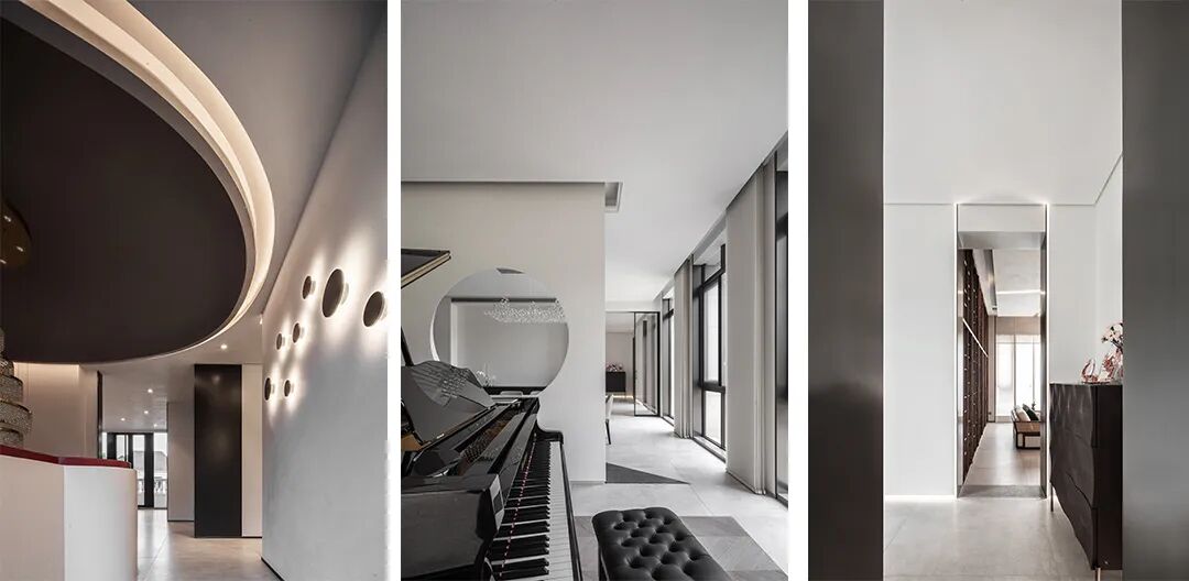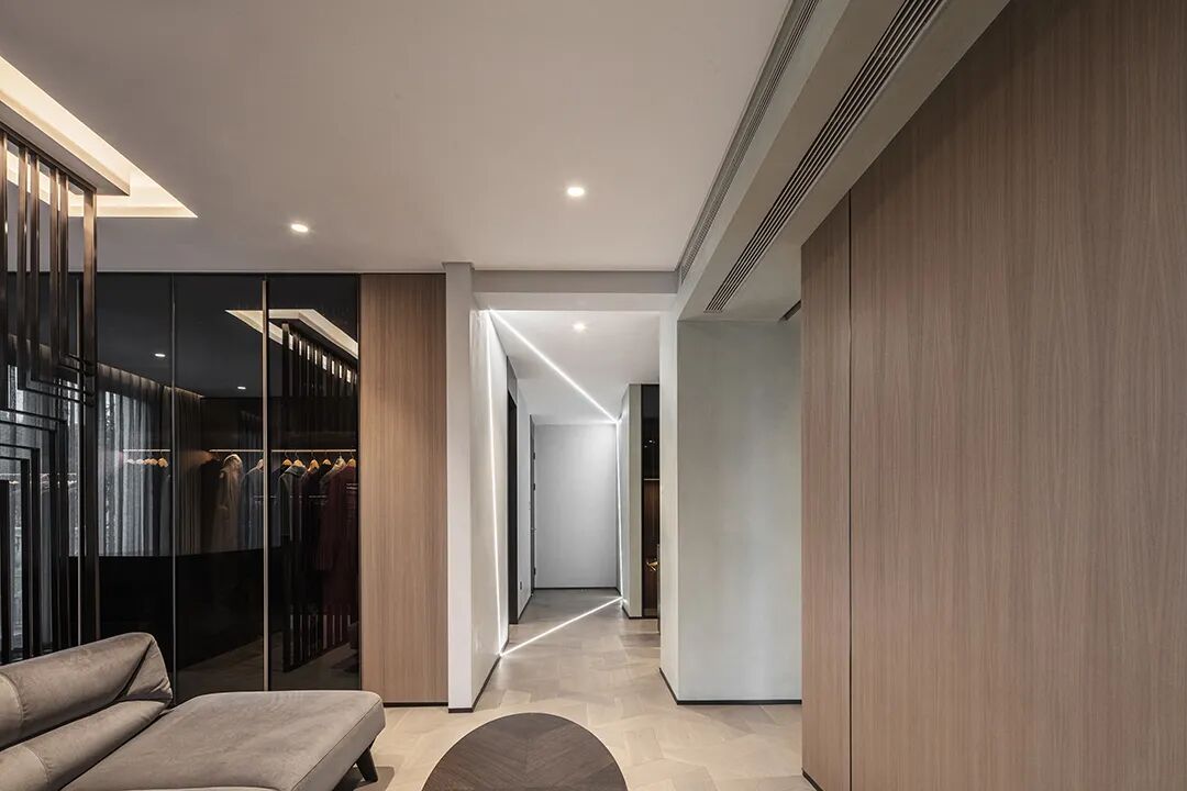 过道共同区域,通过材质的变幻构筑当代设计语境之美,线与形,虚与实,将艺术的美引向生活的日常,让每一处都能相互渗透。
