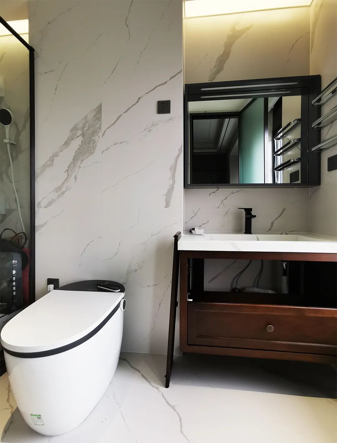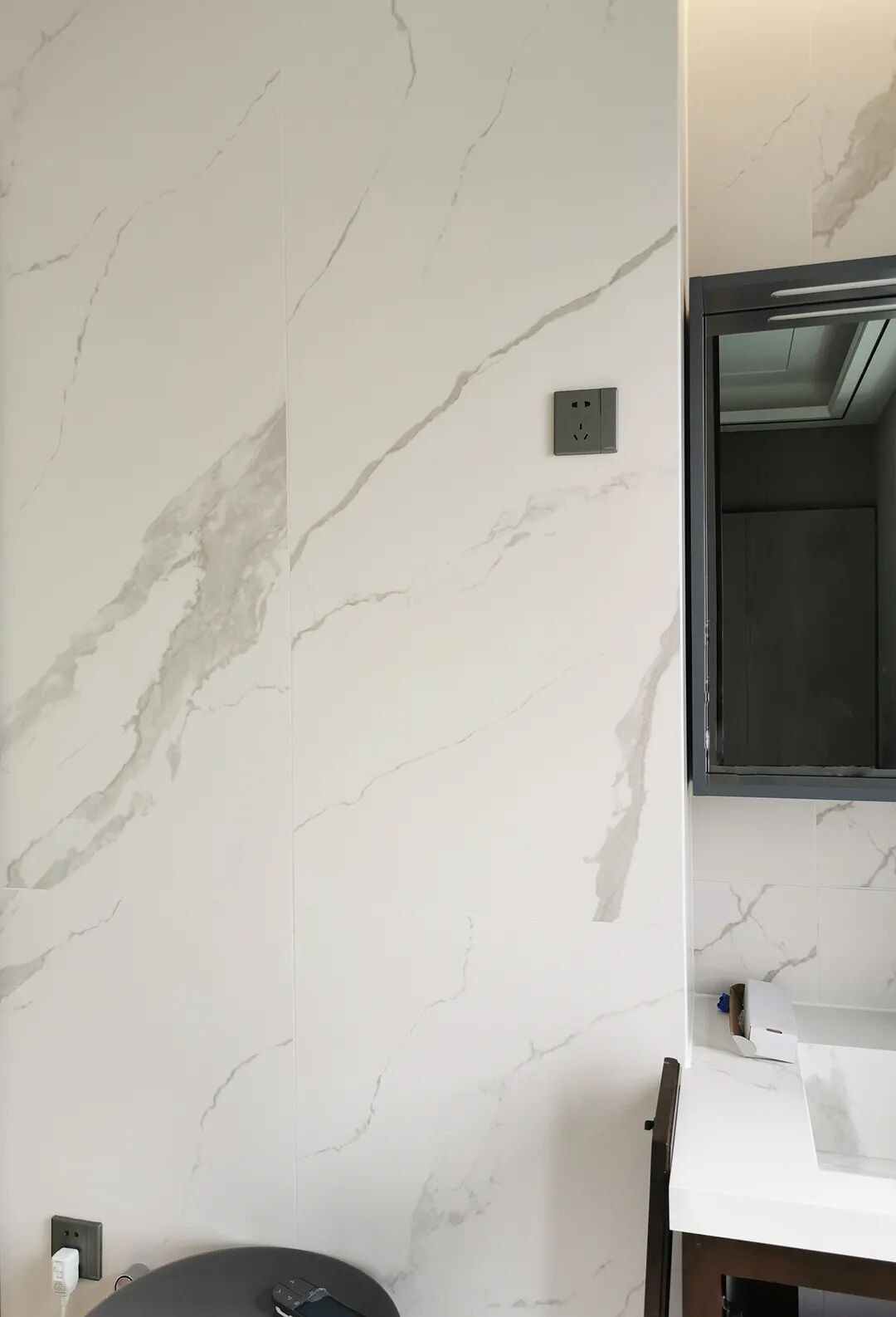 浴室以简洁为主,墙面选用PROXIMA雪花白系列岩板铺贴,灰褐色的纹理无限延伸极具视觉美感,符合明亮洁净的需求又诠释空间的高级感,舒适而且久看不腻。