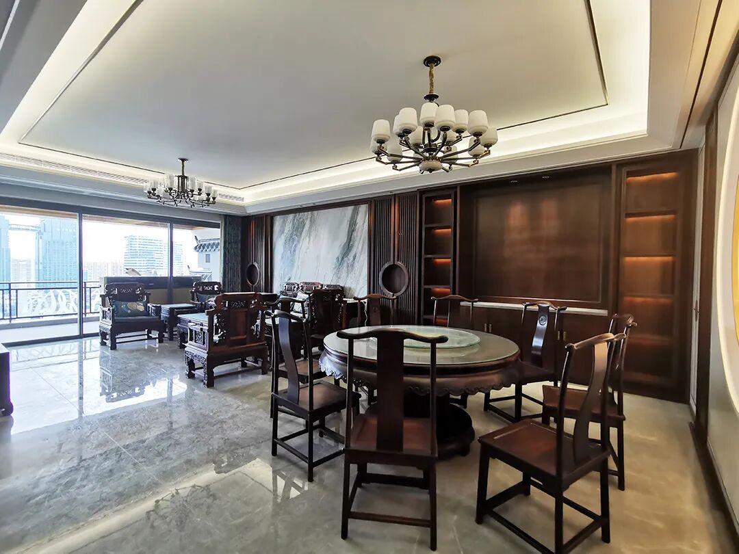 餐厅与客厅分而不割,互相渗透,在自由的空间中形成家庭社交空间。无隔断设计使空间关系更紧密,生活场景丰富多彩,带给一家人舒适优雅的用餐环境与社交体验。