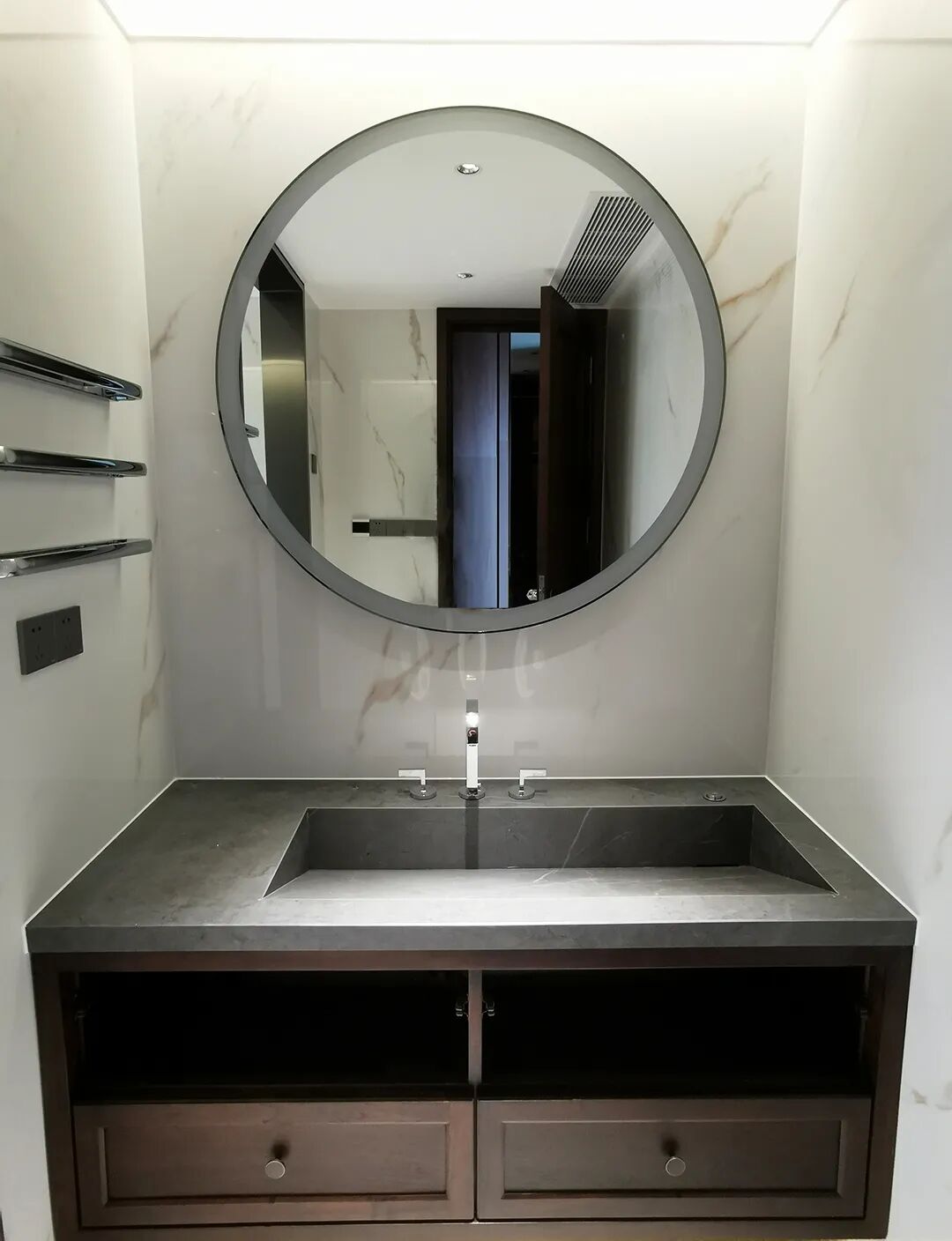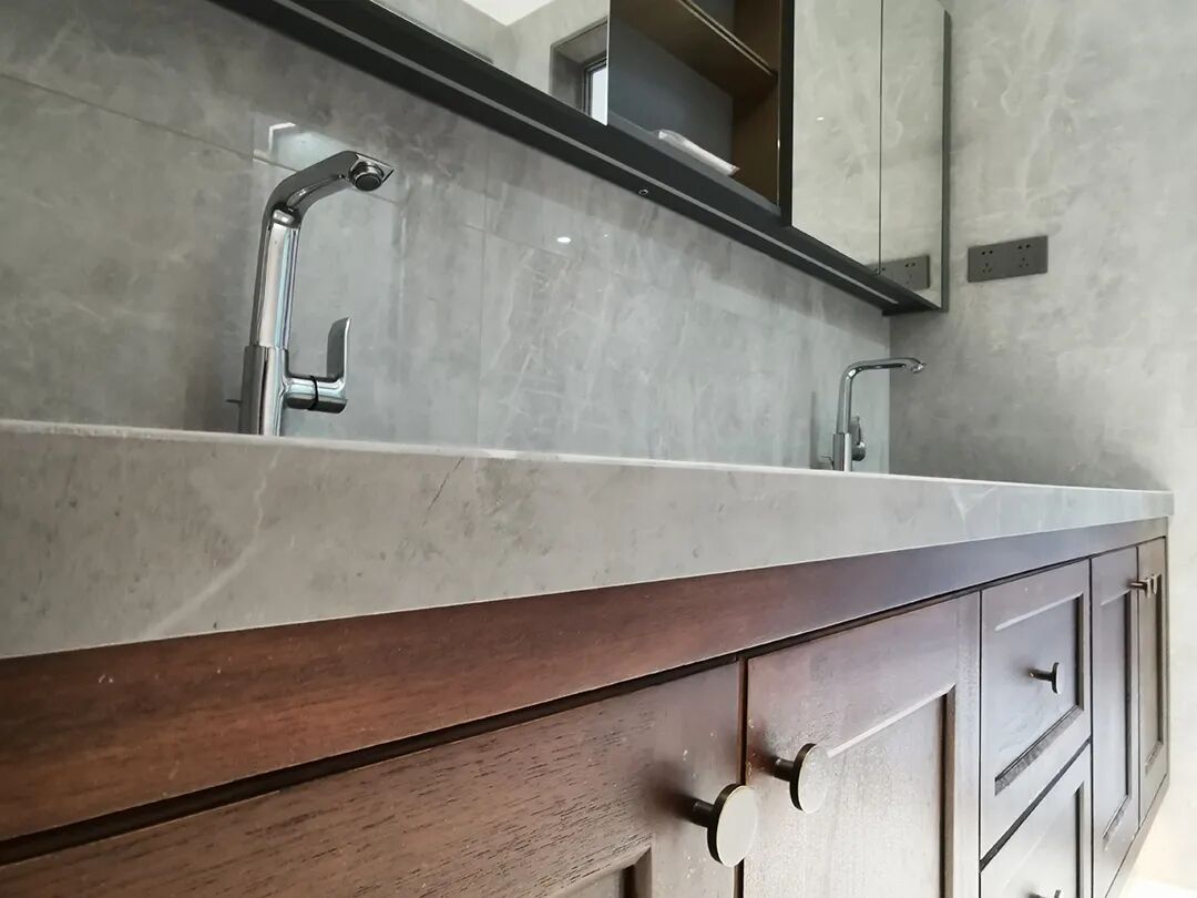 洗漱台,保持一致的设计格调。PROXIMA彼特灰系列岩板搭配中式家具,勾勒出现代中式的内敛雅致,亦古亦今,沉稳中带着灵动,呈现出别具一格的意境。