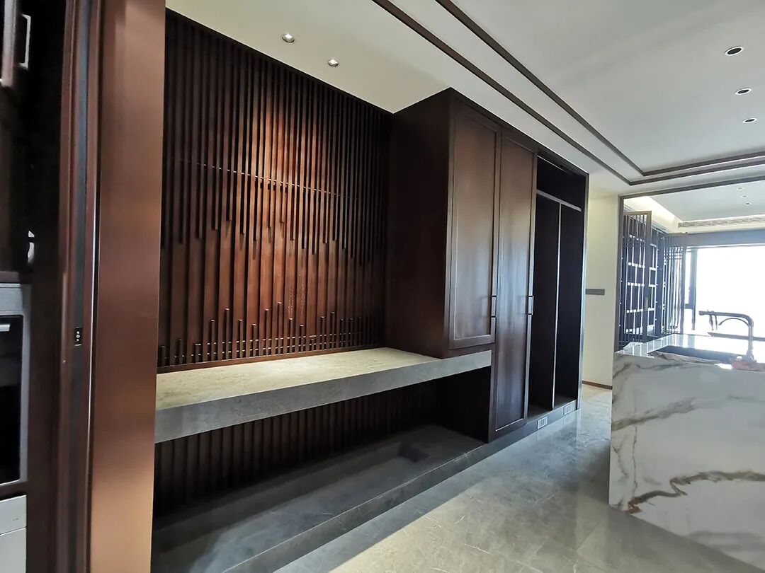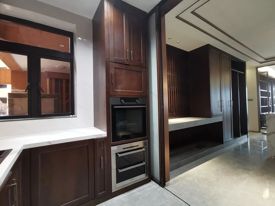 移步厨房内部,中式家具结合了当代造型审美,细节处却又暗暗藏着几分东方的含蓄,搭配嵌入式的家电,使得本就纯粹的空间更加自然质朴。