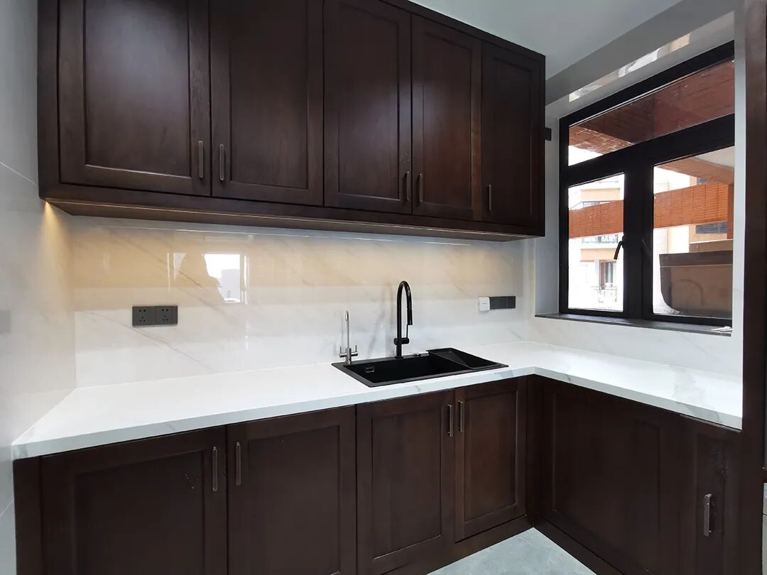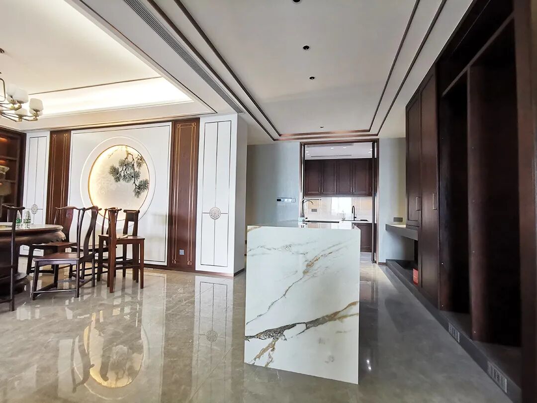 半开放式的多功能厨房设计,让空间界限变得模糊,料理、收纳、隔断,一举三得。木饰面、岩板不同材质的碰撞,生动有趣,形成沉稳又不失惊艳的空间氛围。