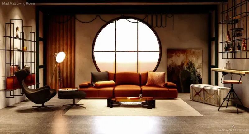 《疯狂麦克斯》的布景设计采用了粗犷工业风。整个客厅几乎不含木材,大部分元素都是金属。耀眼的阳光,用一个大圆形的窗户呈现出来,并在配色中保持沙砾的感觉,有一种后世界末日的感觉。