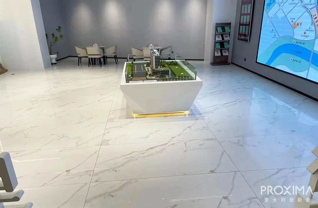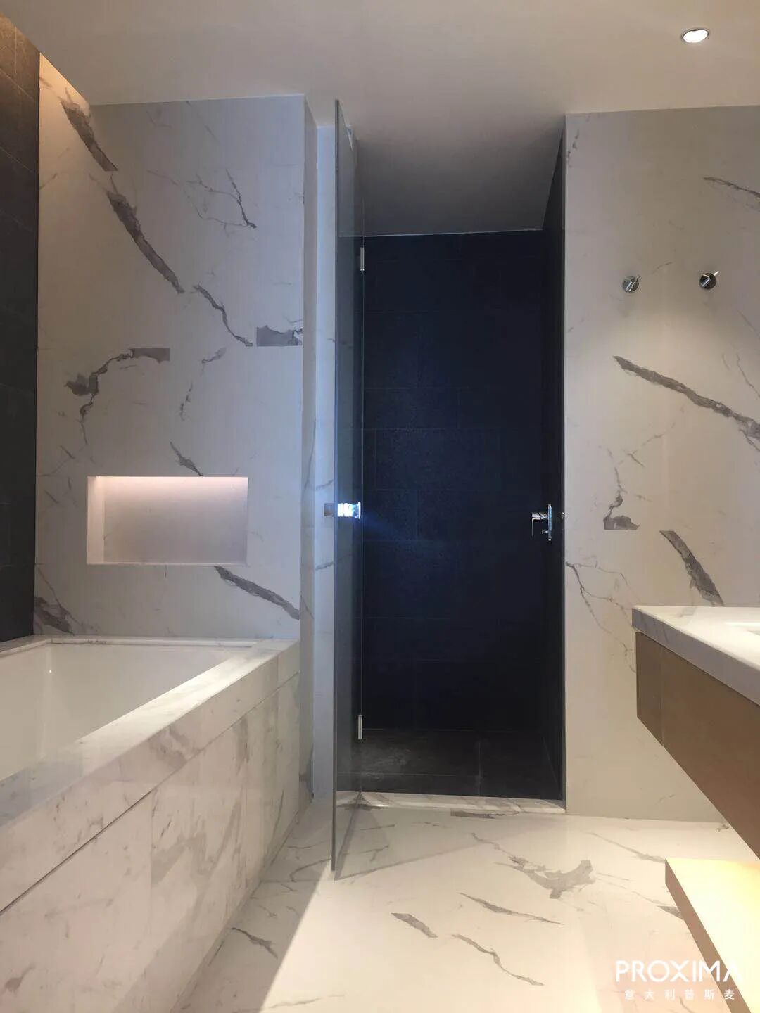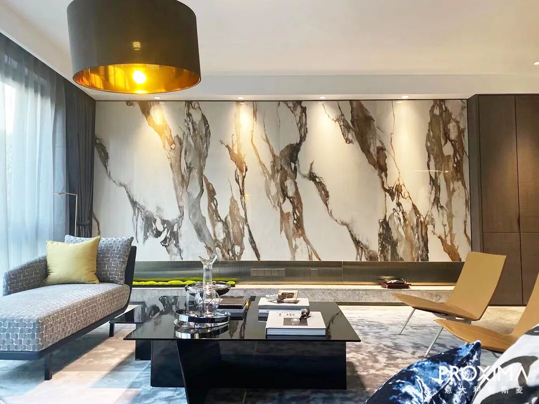 青岛和达·上城,将青岛海湾文化与龙泉湖引入场,打造舒适、雅奢的品质湖居生活示范区。采用PROXIMA雪花白系列岩板,连贯流畅的纹理,延绵成动态之美,铺陈出城市顶层的波澜壮阔。