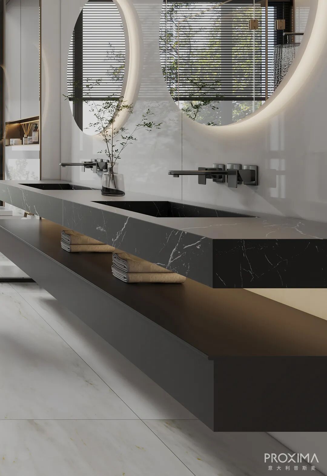 | 地面用材-PROXIMA大理石系列-亚得里亚P7515AD01H;墙面用材-PROXIMA岩板系列-图尼P1632CWN