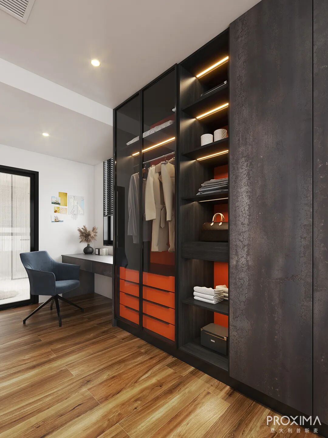 衣柜门采用岩板定制而成,斑驳的铁锈肌理搭配神秘的黑色以及夺目的爱马仕橙,却一点也不觉得压抑,反而满是趣味与高级,给人带来别样的视觉享受。