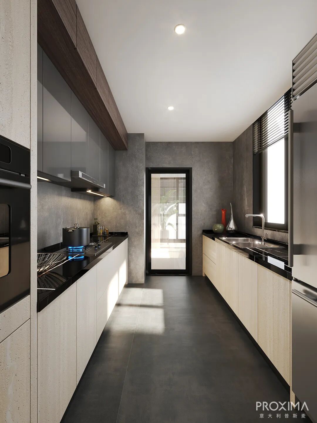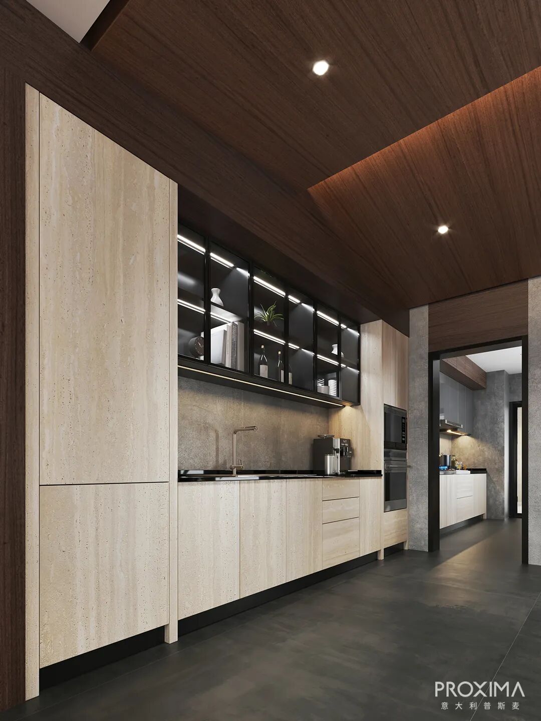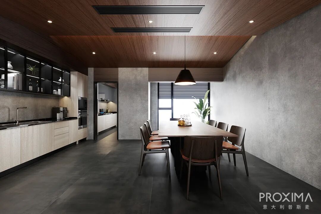| 地面用材-PROXIMA木纹系列-巴里P212BR05;墙面用材-PROXIMA岩板系列-卡拉卡塔P1226CAP;桌面用材-PROXIMA岩板系列-阿尔卑斯黑P1227SBP
