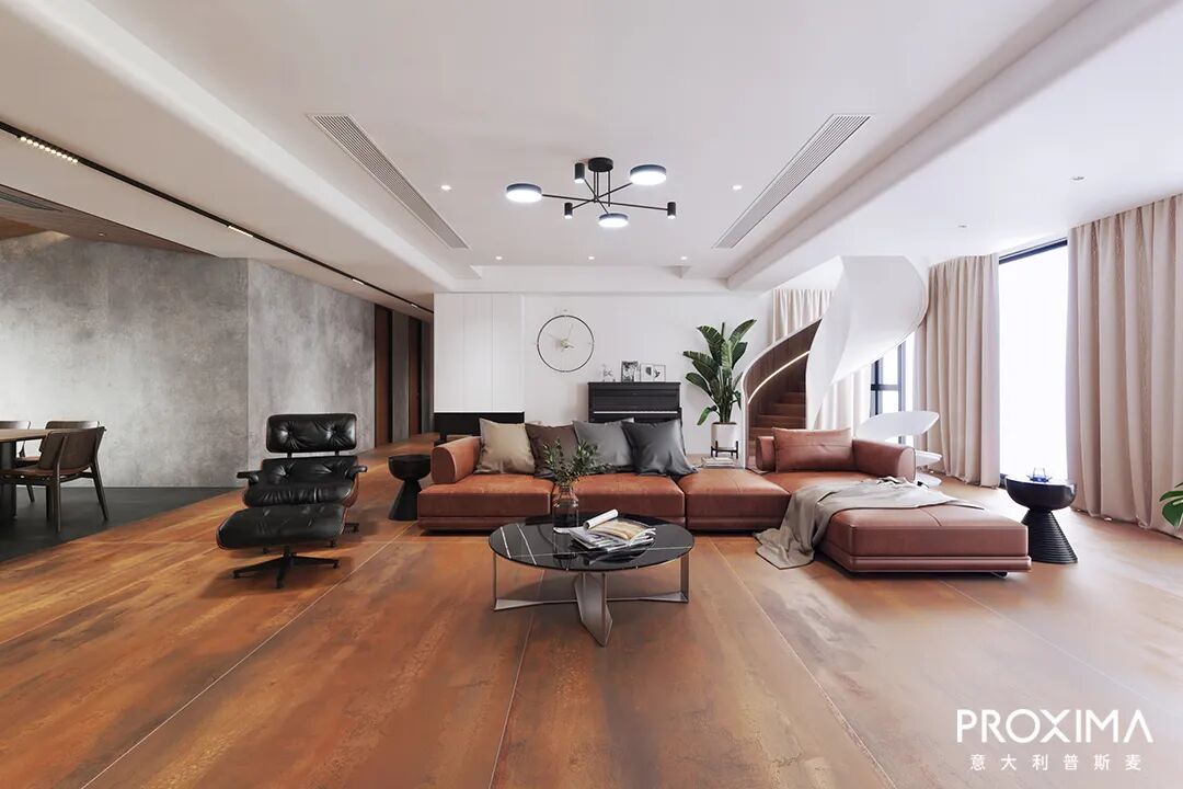 客厅的配色区别于以往的极简清冷风格,以铁锈红为主,搭配米色、皮革色,低调中带着复古和狂野,使得整个空间呈现出自然静谧的原始质感与艺术气息。