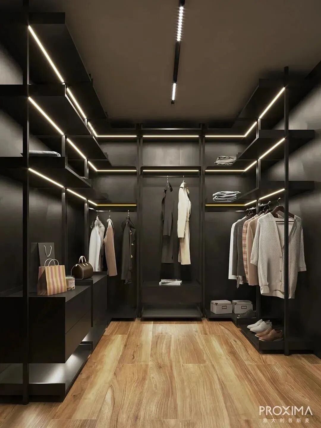衣帽间的精致体现在合理的收纳分区上,更体现在沉稳不失时尚的色调。金属+岩板+木纹瓷砖的搭配丰富而和谐,优雅而克制,潮范儿十足。