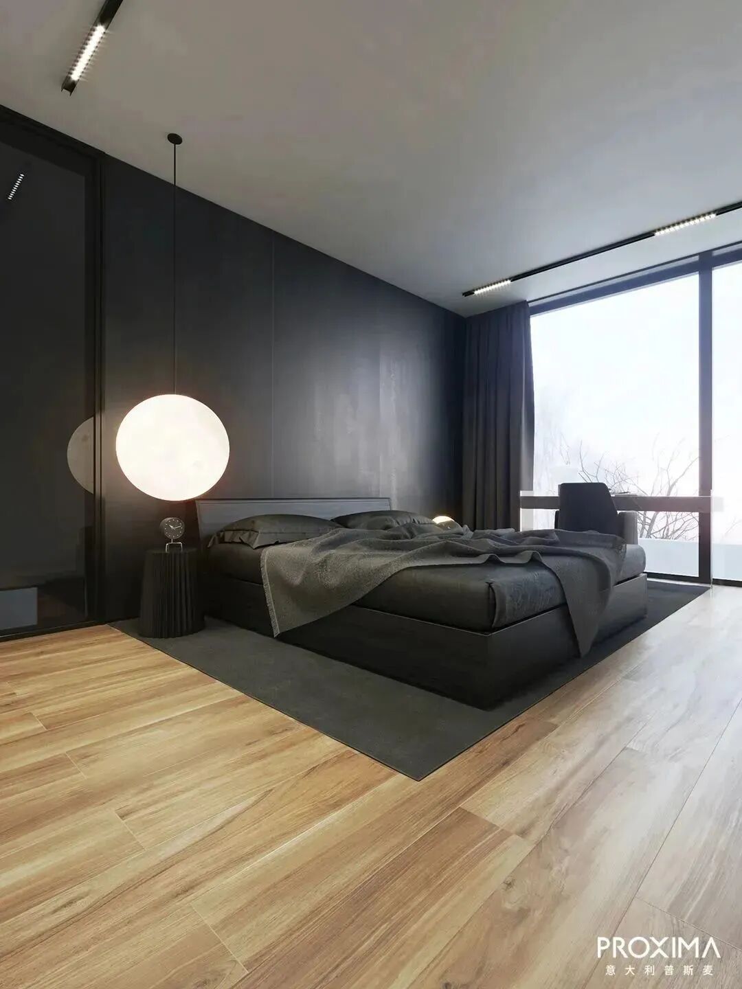 主卧与次卧均采用深色系设计,黑白对立的背景墙,碰撞出空间的层次感,温润而逼真的木纹砖与之搭配的十分和谐,带来起伏和变化,让空间也多了一丝活力。