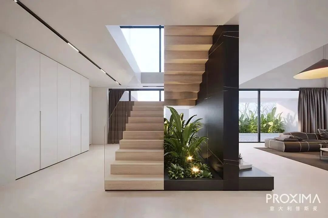岩板作为性能优越的新型饰面材料,用它作为楼梯的主材,防污耐磨,实用性更广,搭配大量的绿植,在嵌入式灯带的照明下,整个楼梯区域充满自然的灵气,将氛围和舒适度调和到刚刚好。