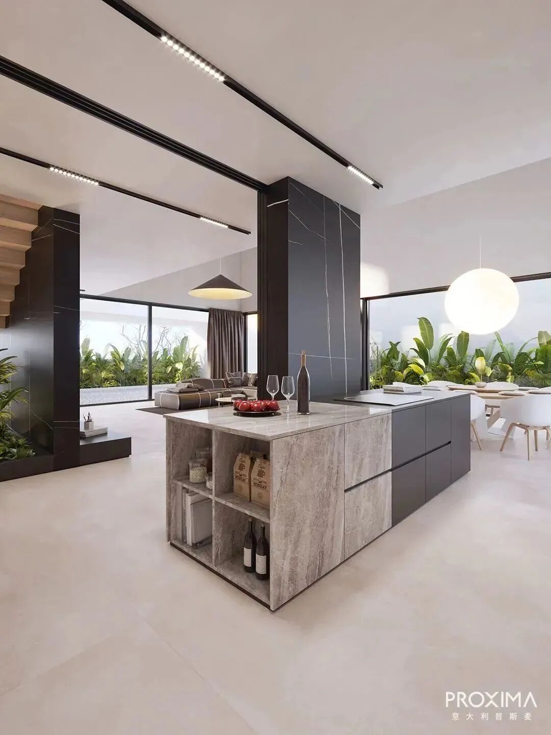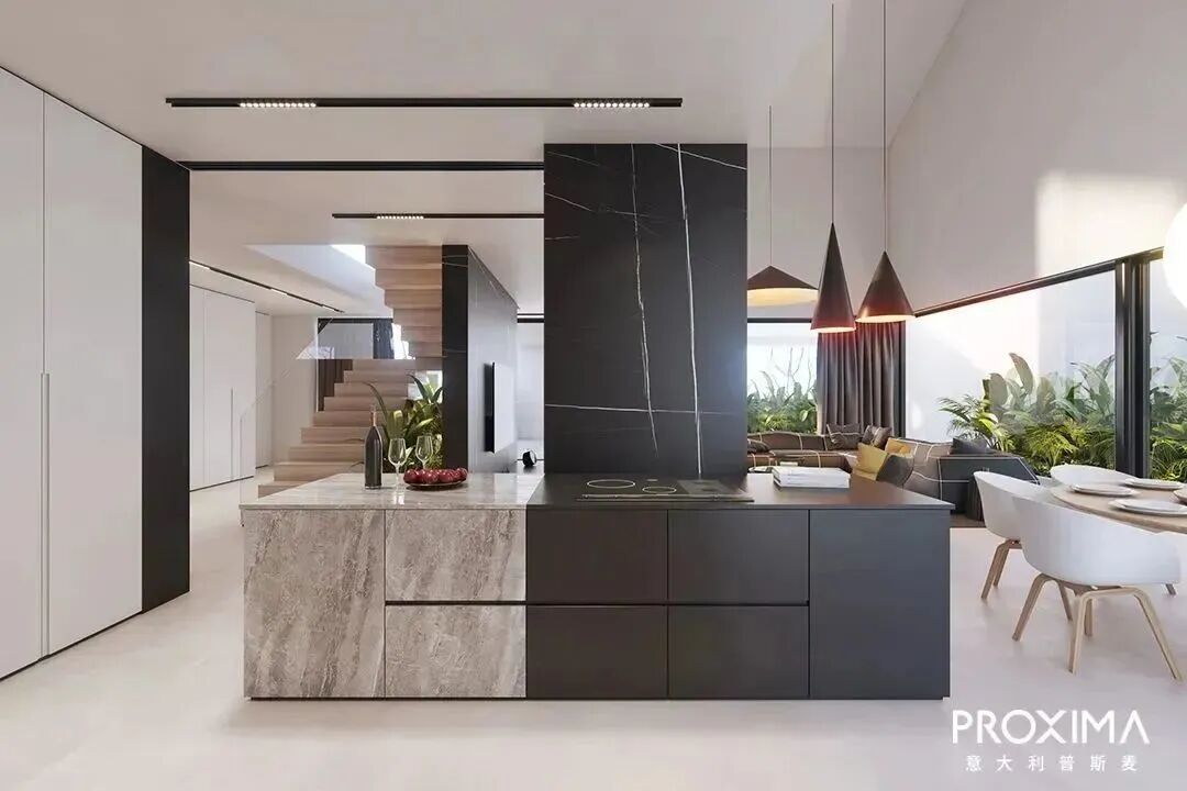 | 背景墙用材-PROXIMA岩板系列-阿尔卑斯黑P1227SBN;地面用材-PROXIMA岩板系列-克雷玛P1228CC02N;橱柜用材-PROXIMA岩板系列-米洛斯P1227SHP