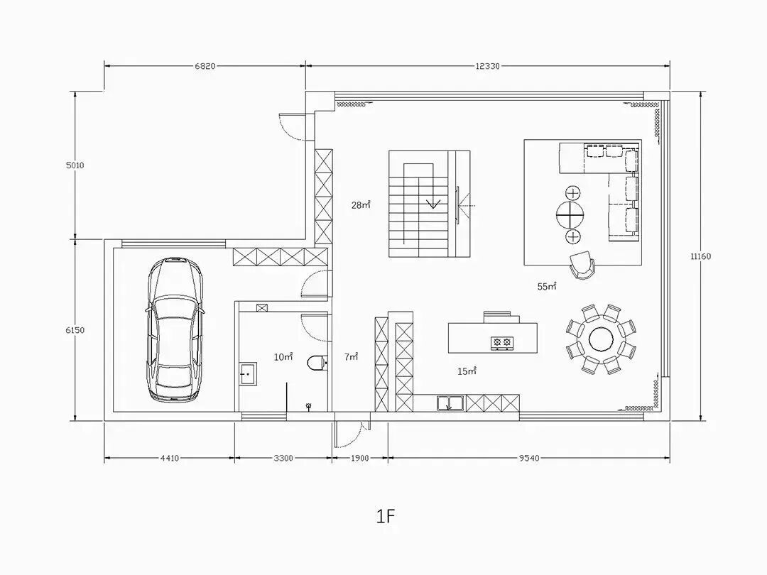 一层作为公共生活区,满足客厅、餐厨、娱乐、社交功能。客厅围绕着“舒适、别致、融洽”为重点,整体色调为黑白,加以奶油色进行点缀;以一种简约舒适的美感去描绘温馨,同时又缔造了大气动感的视觉效果。