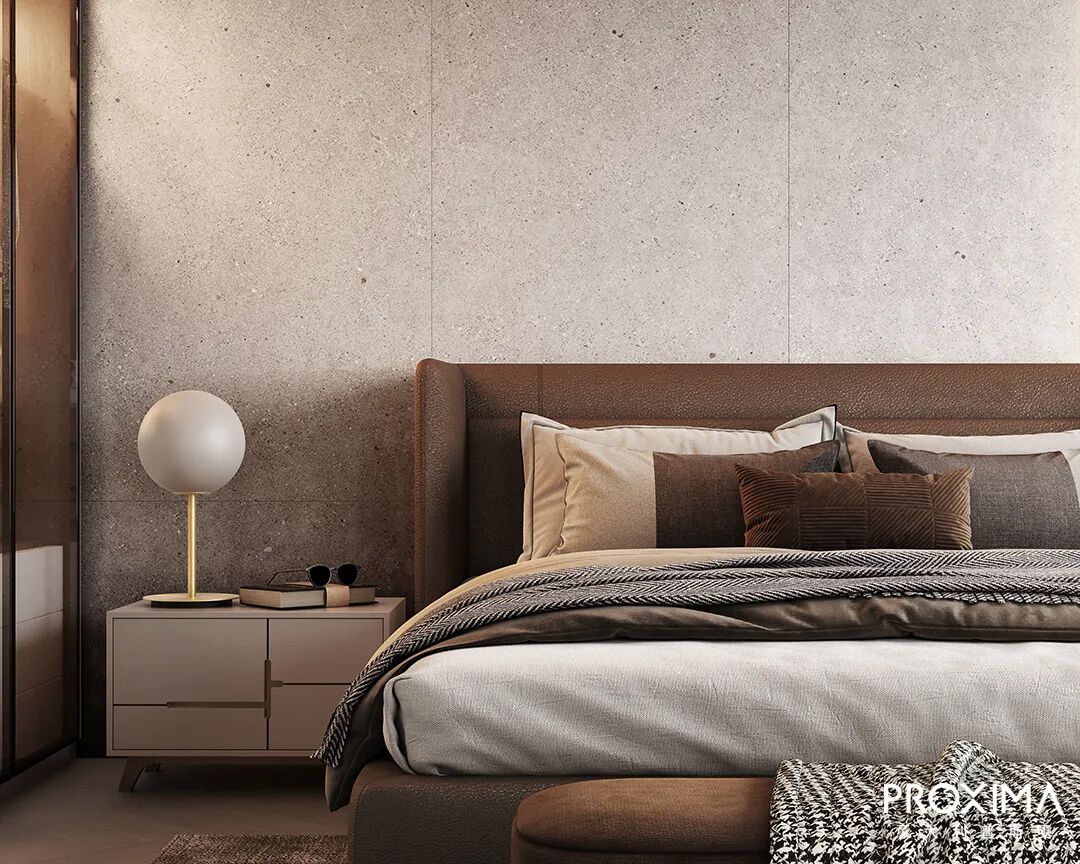 隐匿于砖面的繁星点点,层层叠叠之间皆是淡雅温馨,隐去繁冗设计,配合棕色床品的点缀,让空间进一步增加了暖意与温度,给人以安稳、沉静的空间氛围。