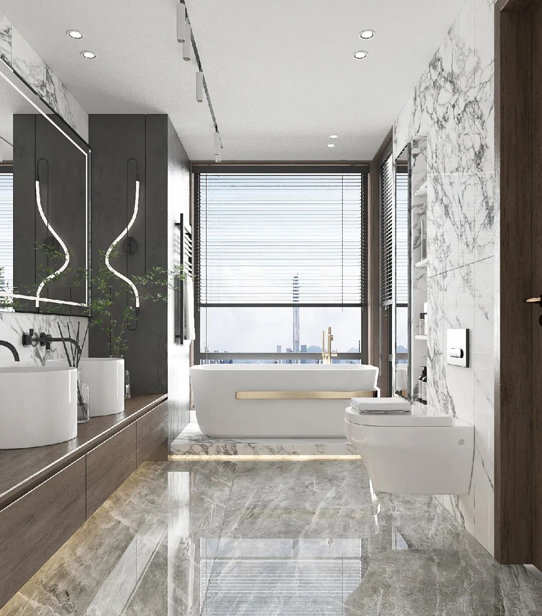 在黑白灰的空间调性中,精选时尚款式的洗浴用品与精致的饰品摆件,共同营造空间之优雅,给予居住者都会轻奢的品质体验。