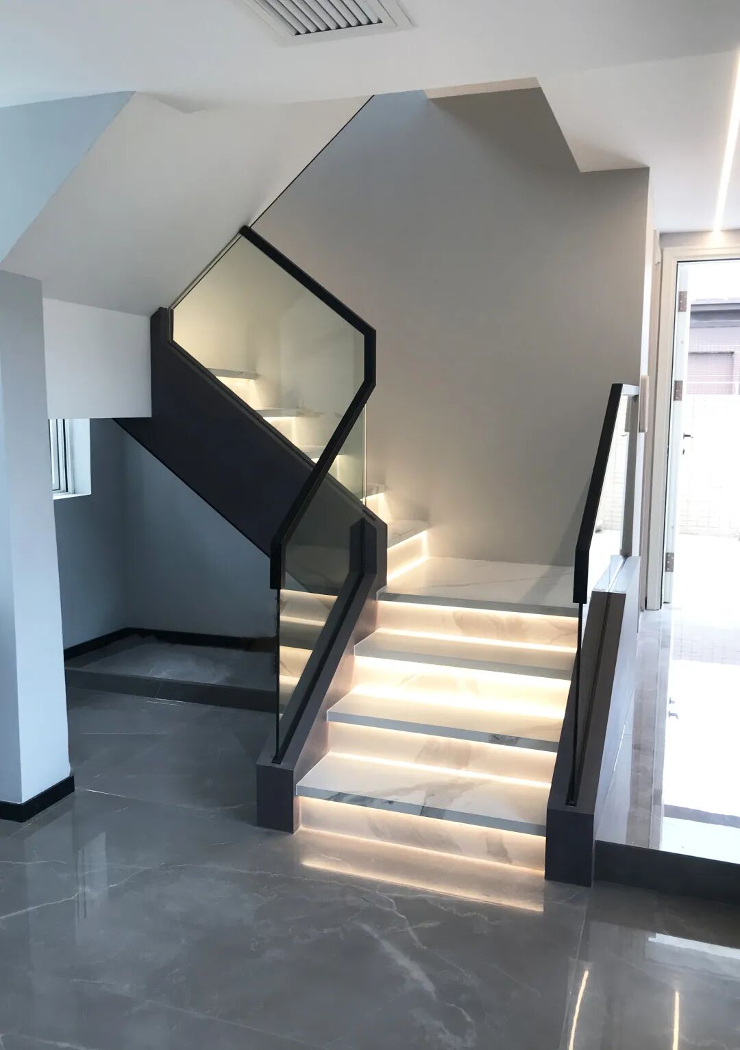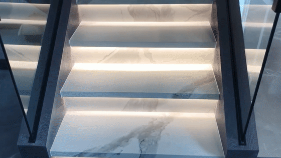 错落有致的岩板楼梯,将材质、色彩、光源巧妙融合,张弛有度中表达一种随意、舒适的氛围,不经意间增添了时尚感和新颖感。