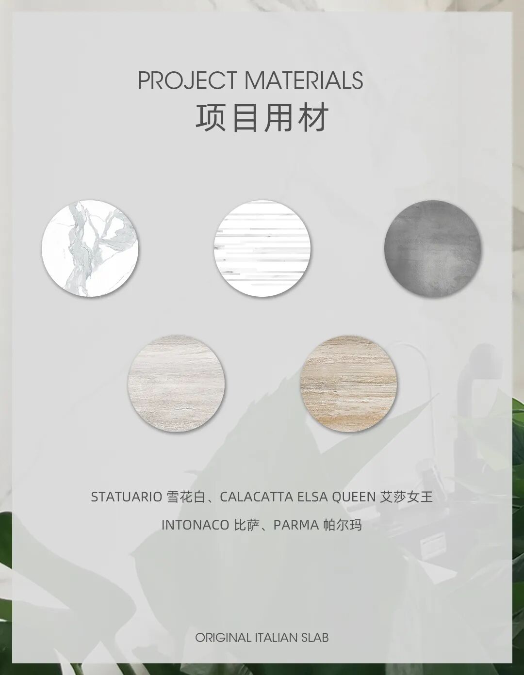 项目用材:STATUARIO 雪花白、CALACATTA ELSA QUEEN 艾莎女王、PARMA 帕尔玛、INTONACO 比萨